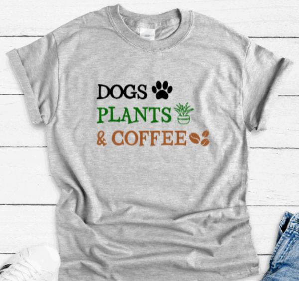 Dogs, Plants & Coffee, Gray Short Sleeve Unisex T-shirt