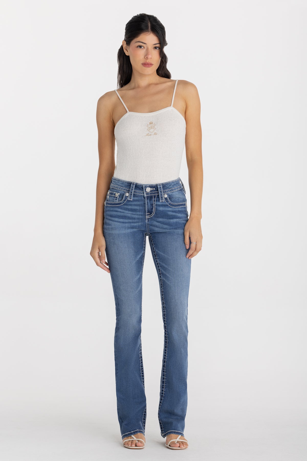 - Embossed white leather cross Miss Me brand patch