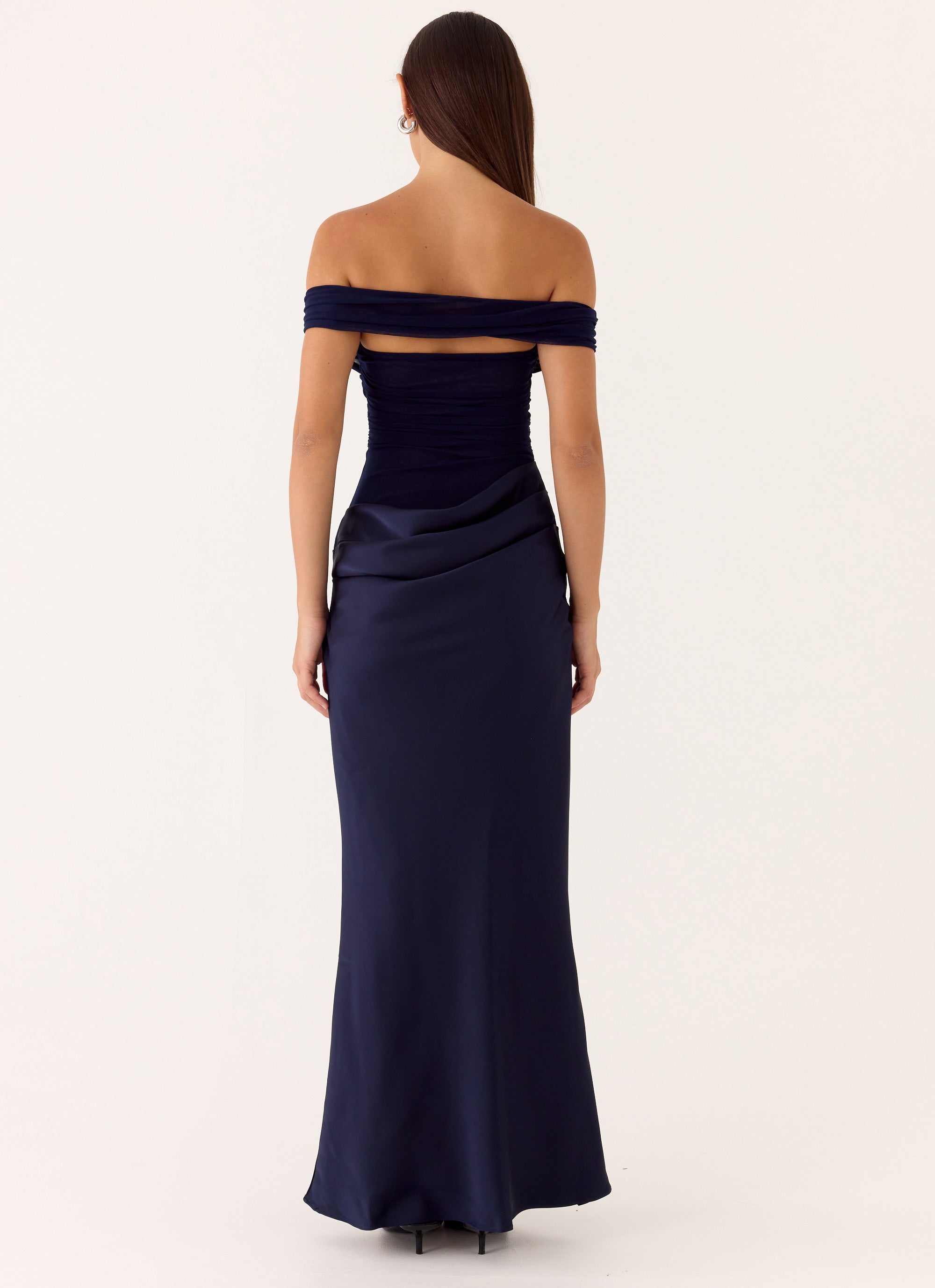 The Alicent Maxi Dress is an elegant off-shoulder maxi featuring a sheer mesh bodice with a satin bust and elasticated silicon taping for support. The draped satin skirt adds a luxurious flow, perfect for evening events or special occasions.