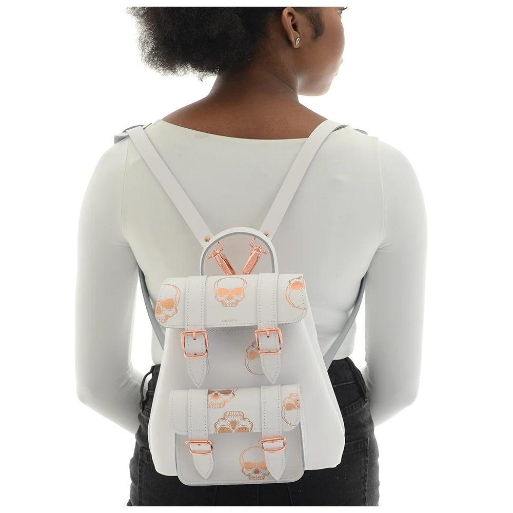 • Colour: white, rose gold • 100% Leather• Small Size Backpack• One Front Pocket• Magnetic Front Buckles• Two adjustable shoulder straps• Made in England
