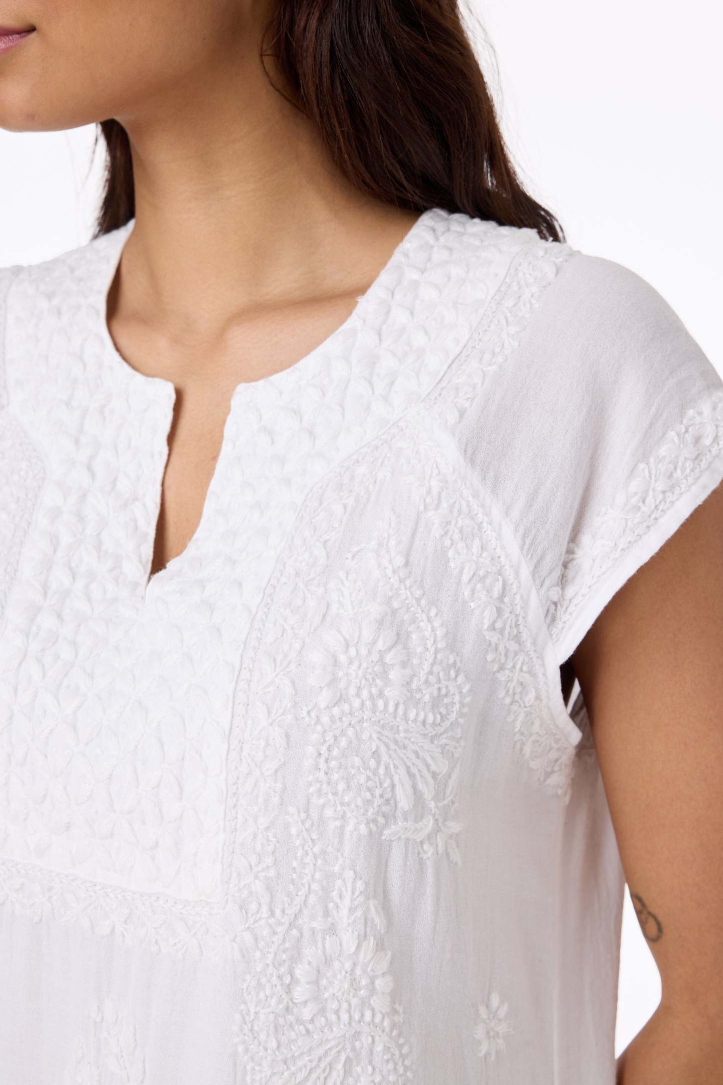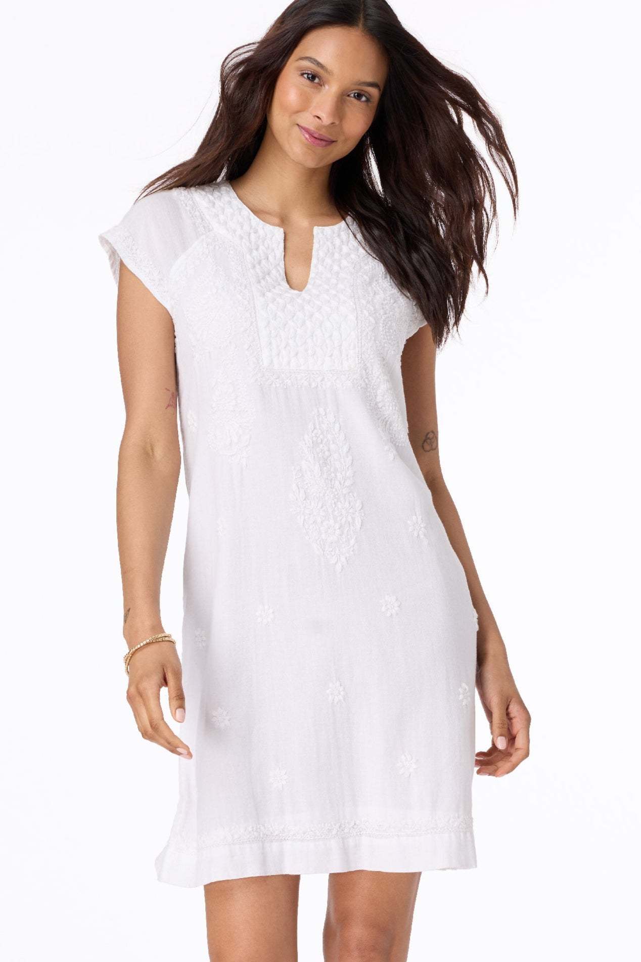 Our classic Faith dress symbolizes elegant, effortless style, and is a must-have for your wardrobe. It features a lightly lined slip, cap sleeves, a notch neckline, and intricate embroidery throughout.