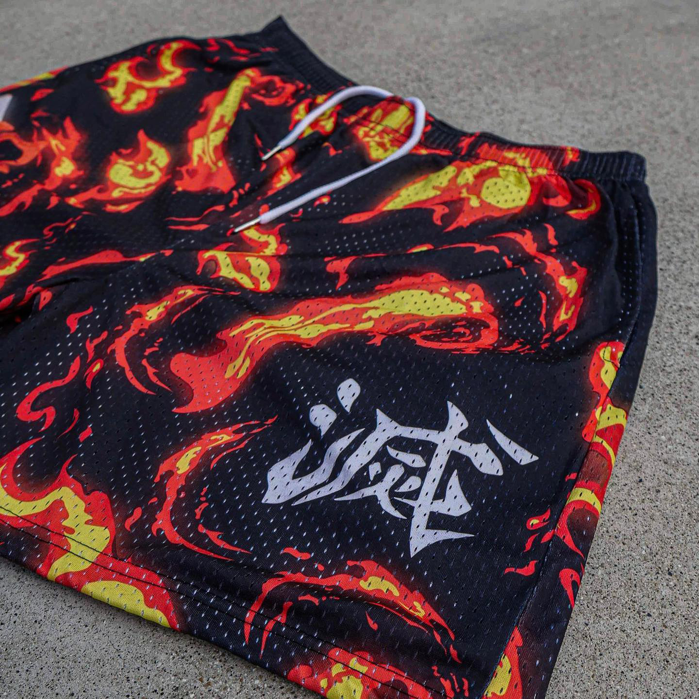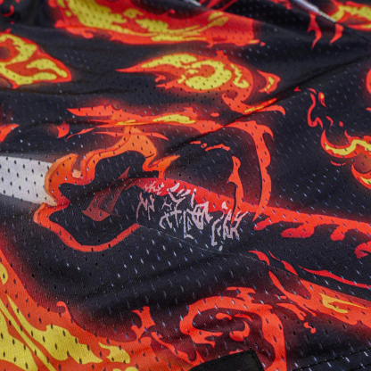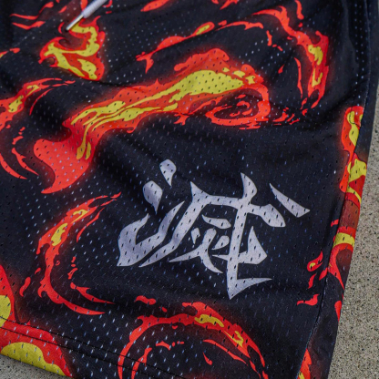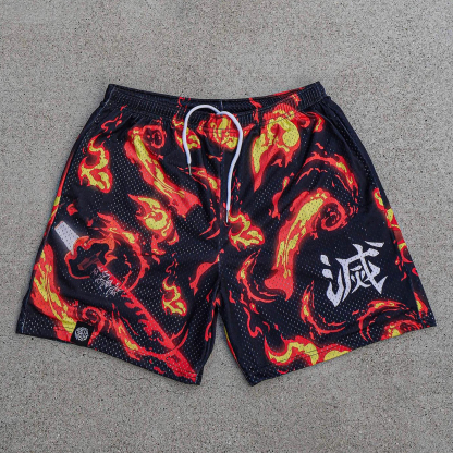 flame anime print mesh shorts