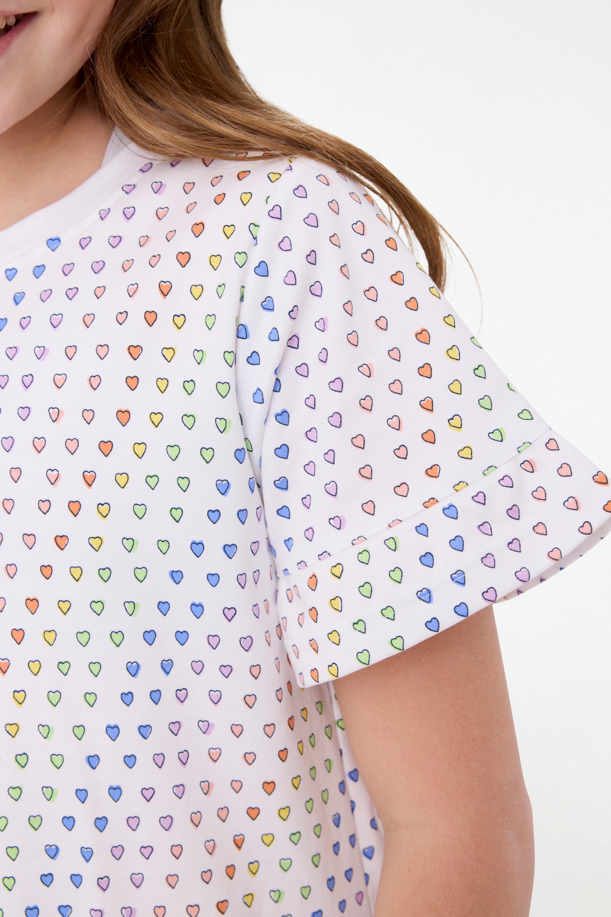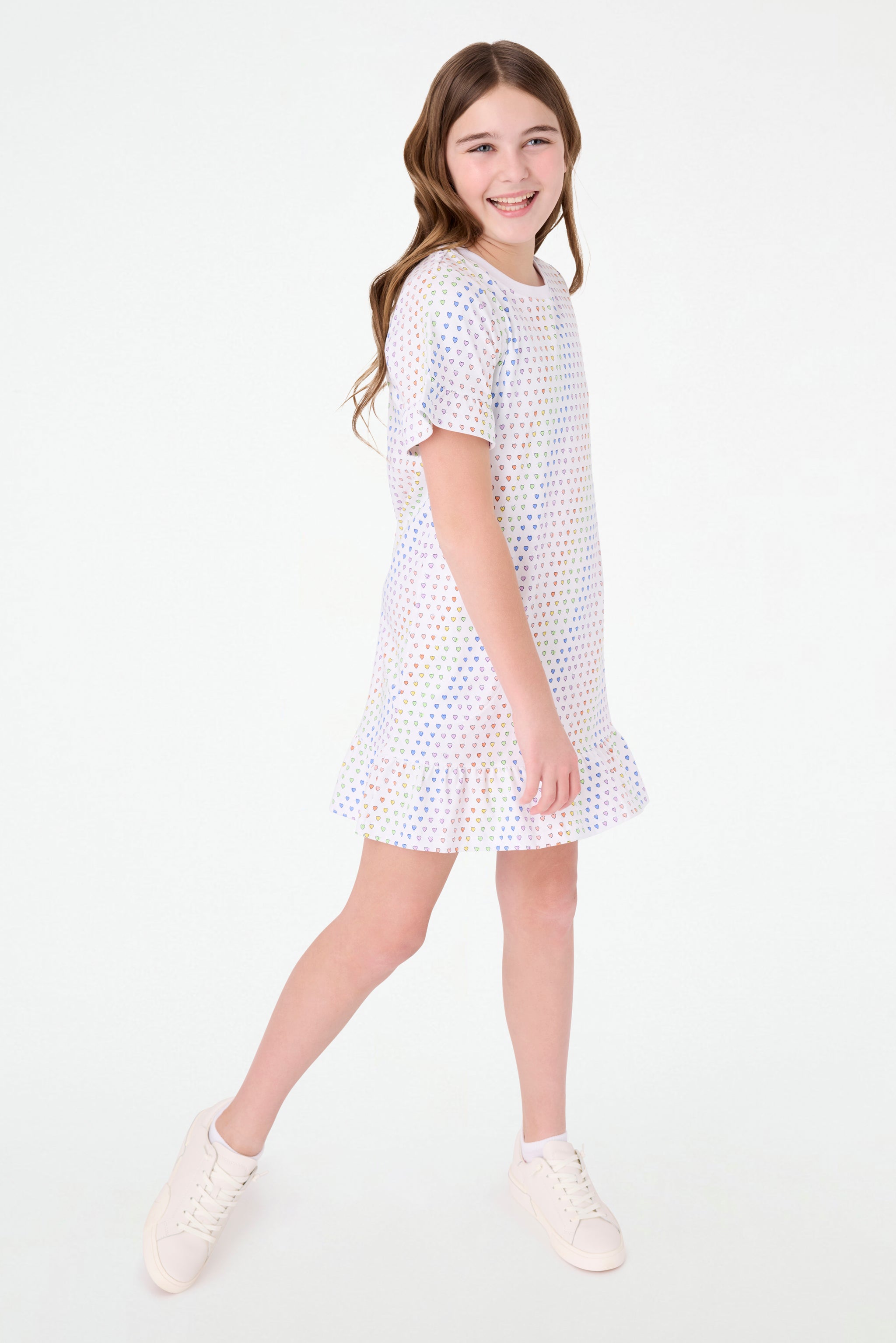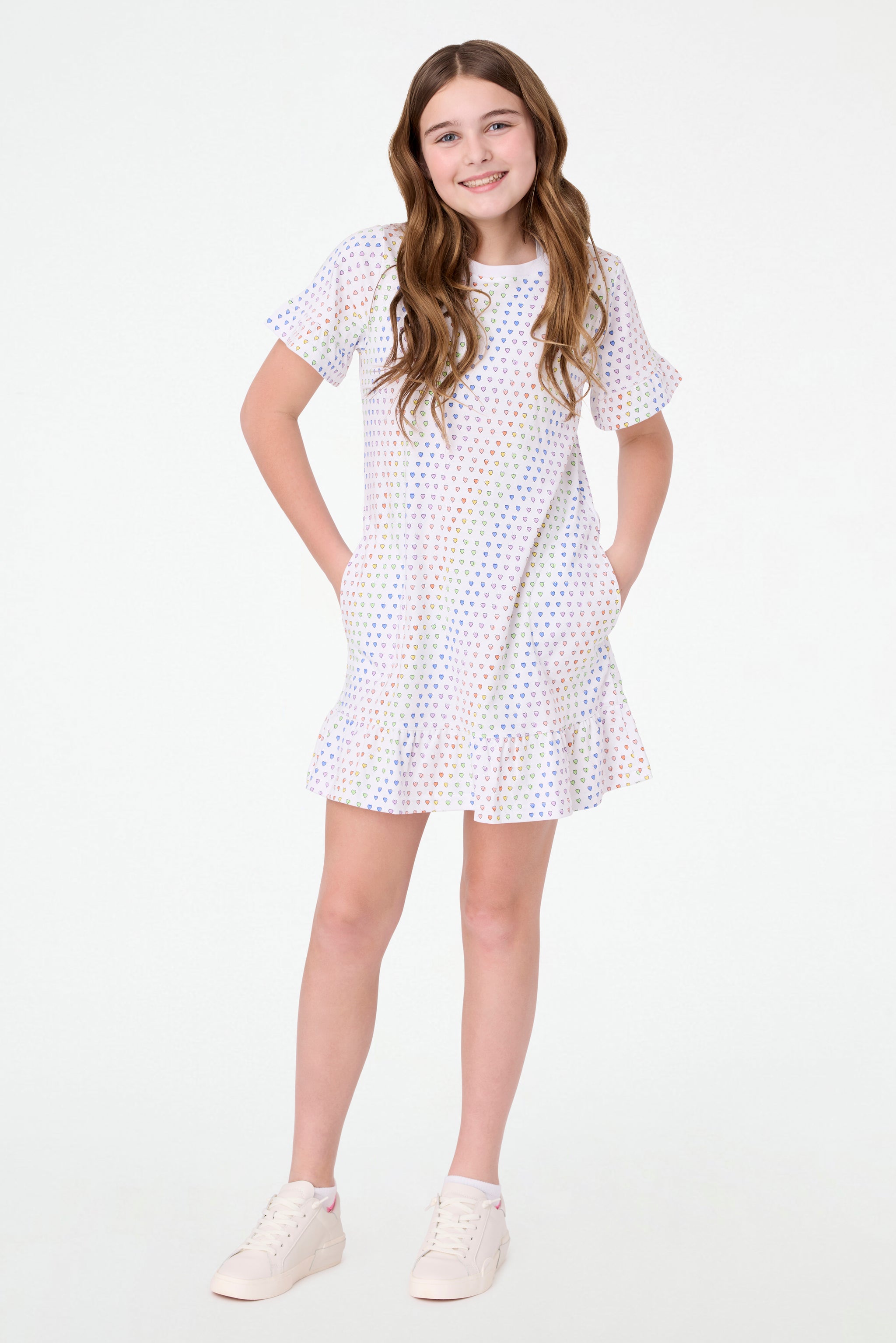 This new dress features cozy cotton and a casual T-shirt fit for that "throw it on and go" ease on casual days. Ruffled trim at the sleeves and hem adds just the right amount of dressy flair for playdates.
