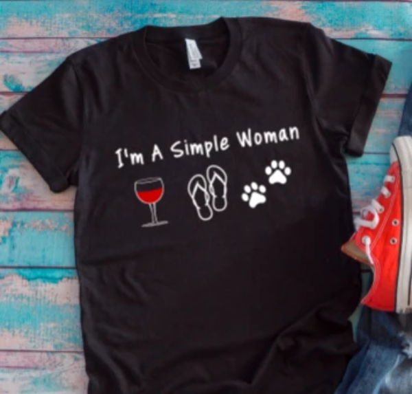 I'm a Simple Woman Wine, Flip Flops, Paws Black Unisex T-shirt
