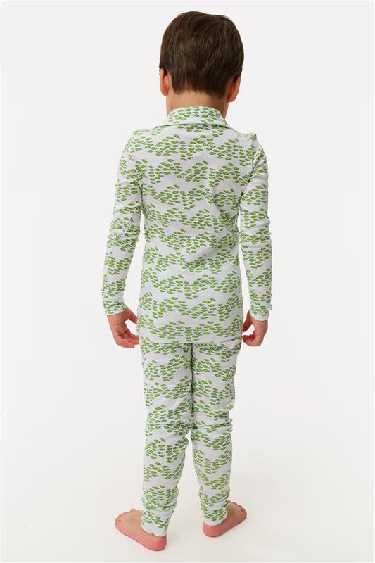 Your little one will dive into bed wearing our Parker Polo Pajamas, a two-piece set with a polo collar and cute green-and-white minnow print. They're the perfect balance of sporty and sweet.