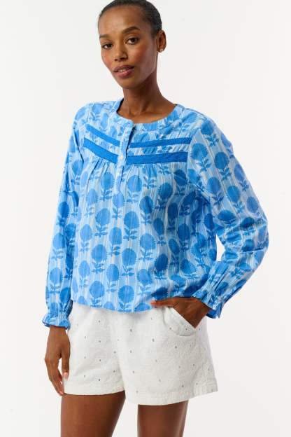Stand out in the vacay crowd with the bold blue floral print of our long-sleeved Jasper Top, a romantic pullover blouse with subtly puffed sleeves in the prettiest shade of true blue.