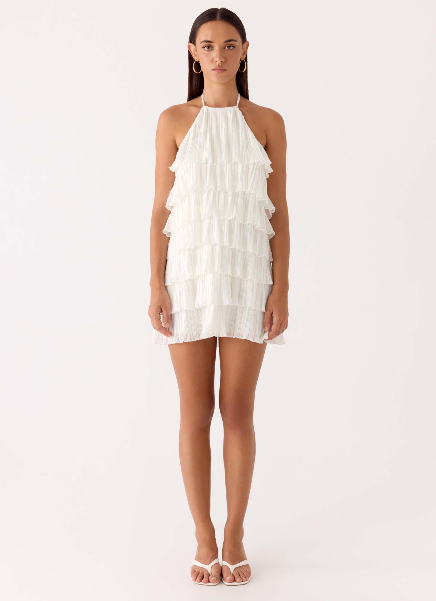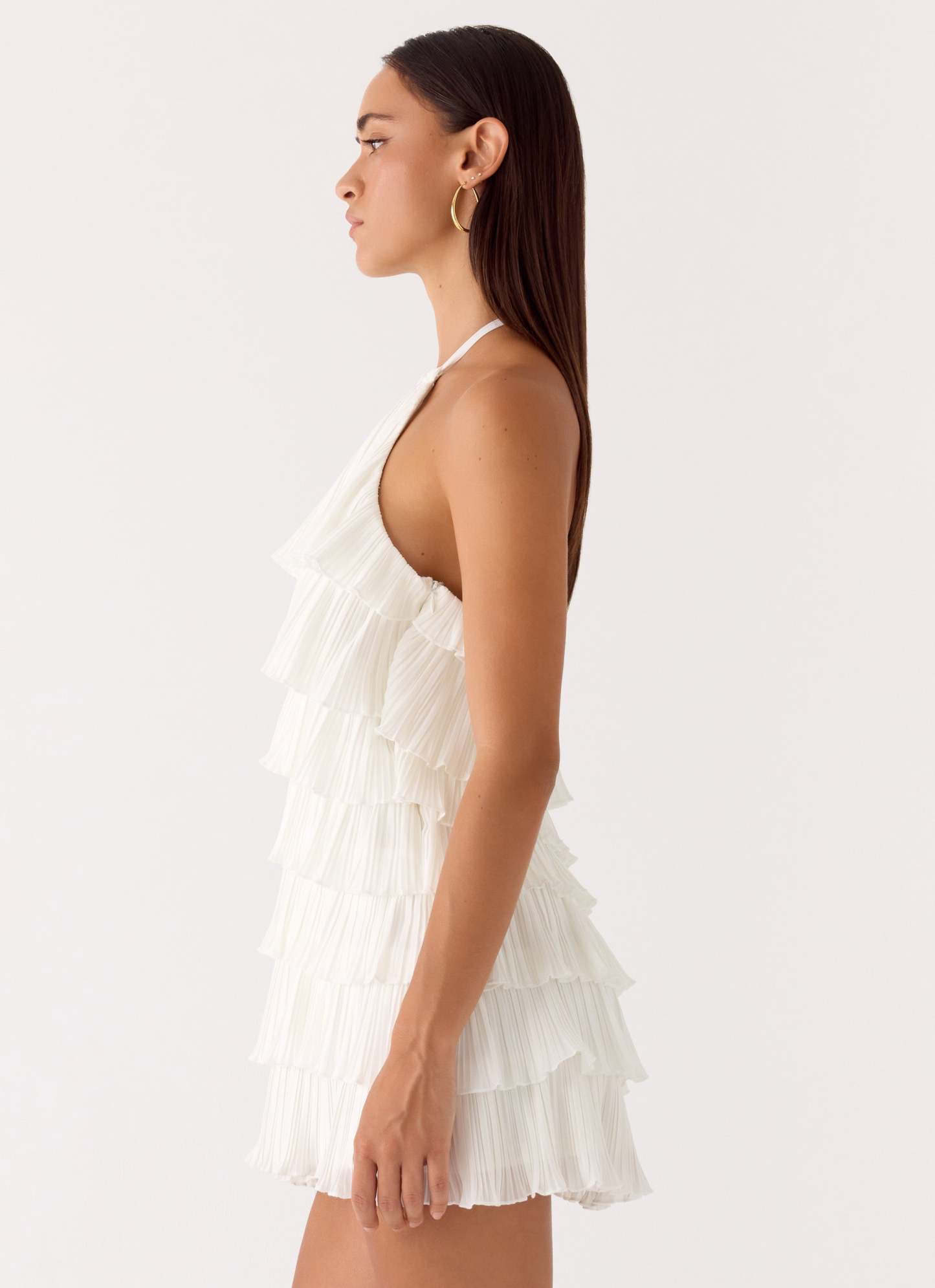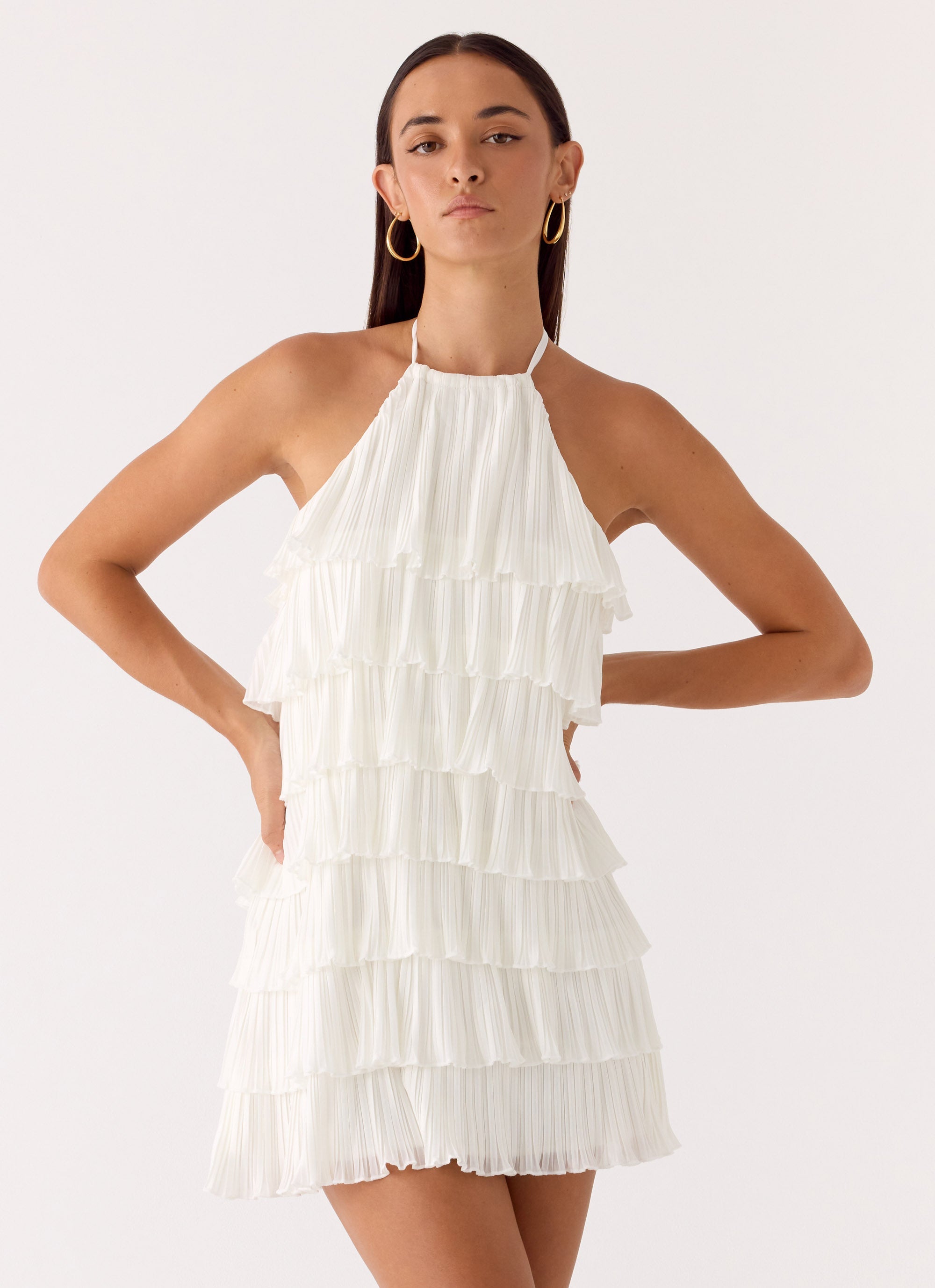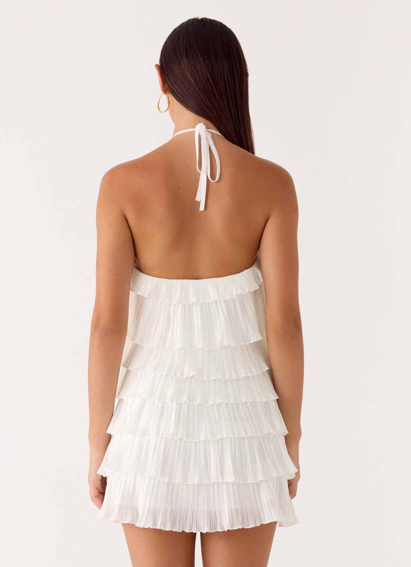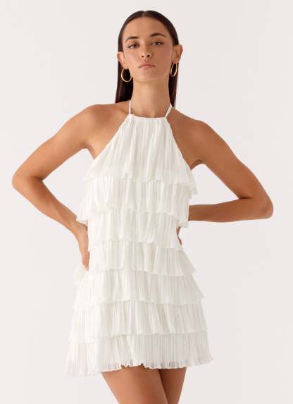 The Lunar Bloom Mini Dress is made for golden skies and after-dark romance. Designed with a halter neck strap and cascading tiered ruffles, it creates playful movement with every step. Fully lined for a smooth fit, this mini silhouette captures effortless femininity from sunset to sundown.