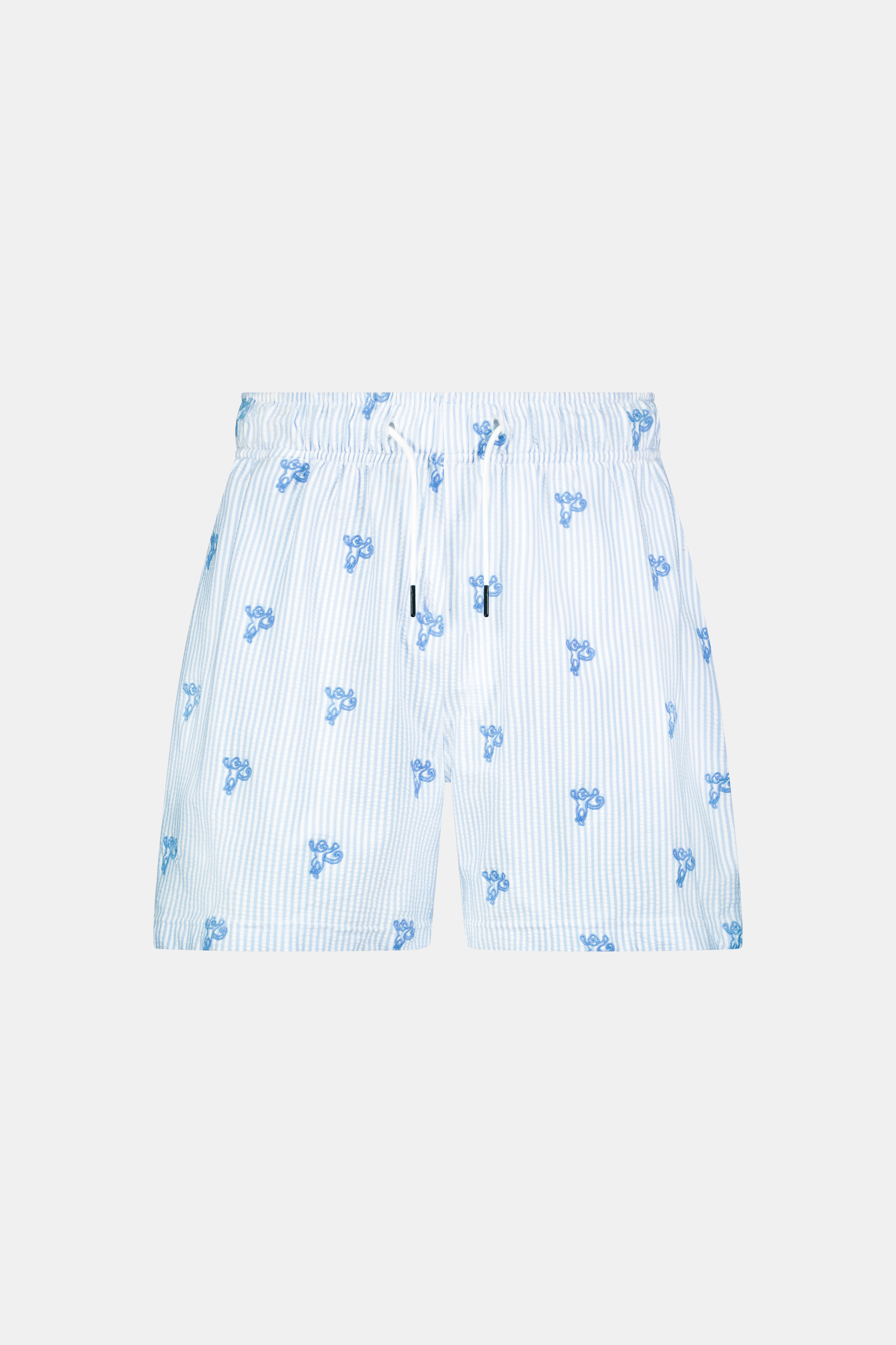 Made for chilling poolside or practicing your cannonball, these classic-fit men's swim trunks are perfect for vacation vibes or summer fun. The crisp blue and white seersucker looks great and feels even better.