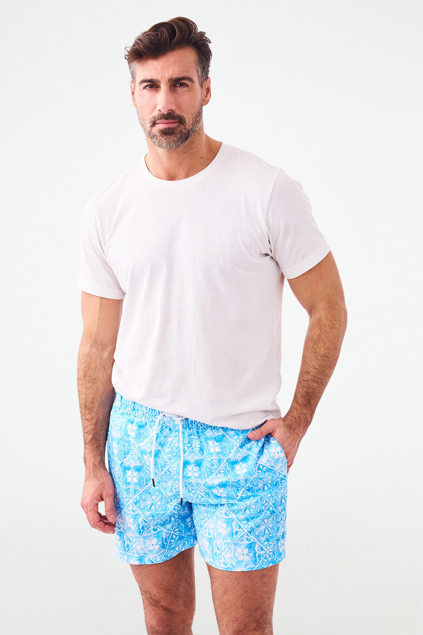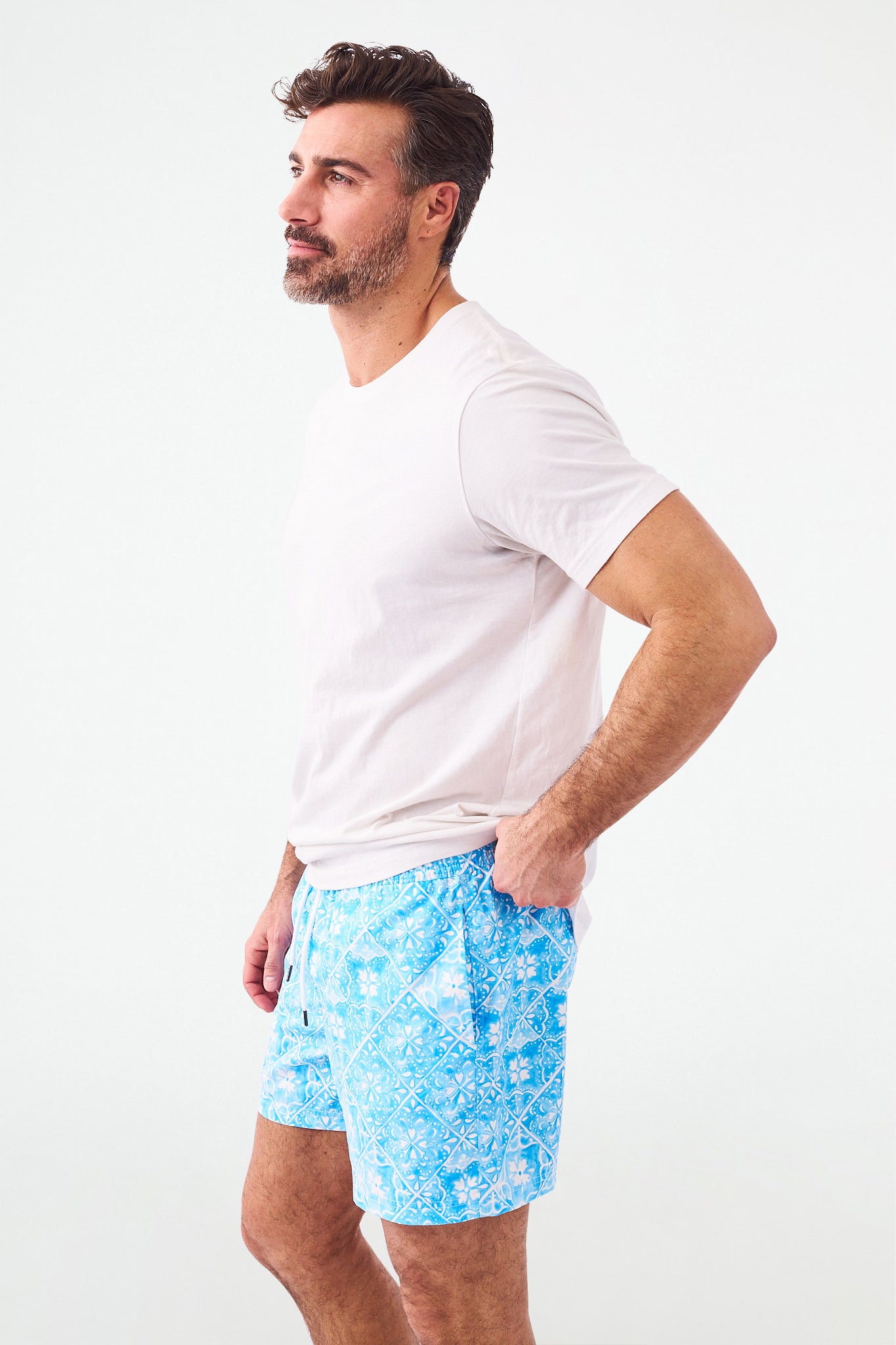 Catch you on the Amalfi Coast in the Men's Swim Trunks, a timeless short style with a tie waist and side pockets in our light blue Flores Tile print. Pro tip: Grab the matching Kids Swim Trunk for your mini-me.
