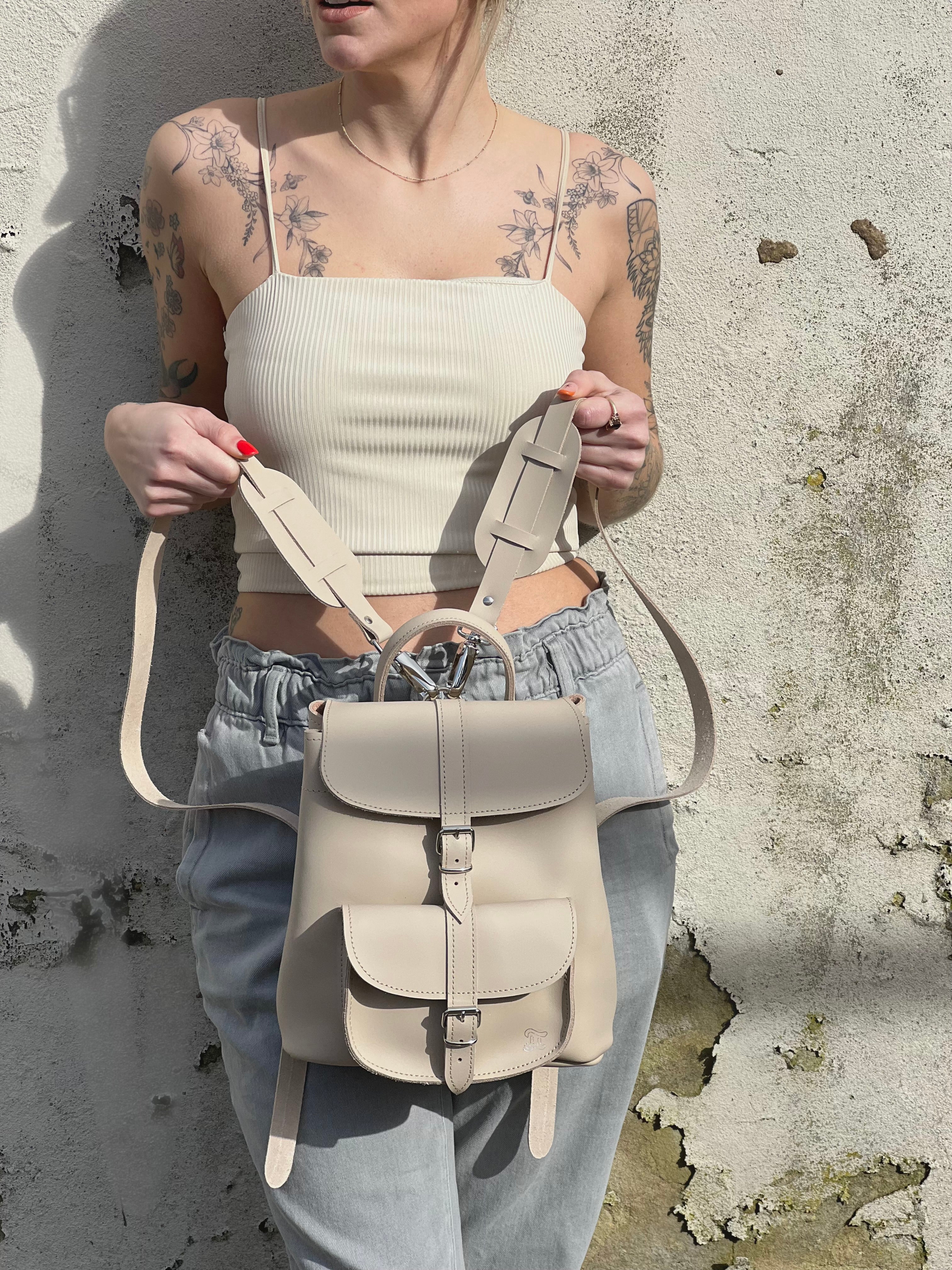 • Colour: beige brown• 100% Leather• Small Size Backpack• One Front Pocket• Two adjustable shoulder straps• Made in England