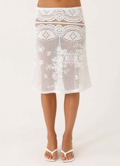 The Yanna Midi Skirt is made for golden hour moments that linger into balmy nights. Featuring a low-rise silhouette, elasticated waist, and delicate lace fabric, it drapes effortlessly with a flowing midi length for an easy, feminine feel. Perfect for sunlit strolls and evening escapes.